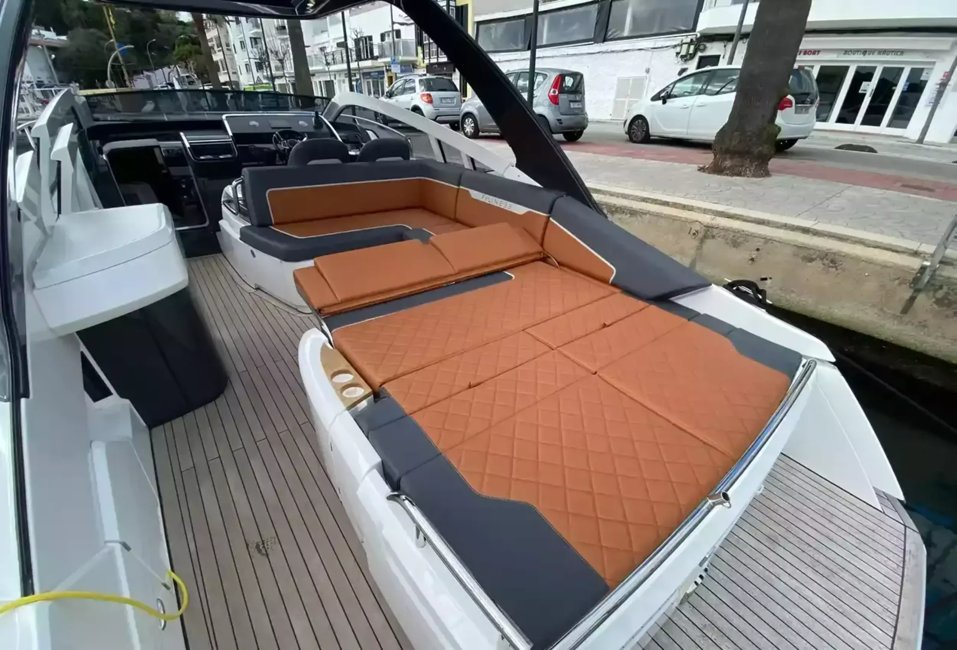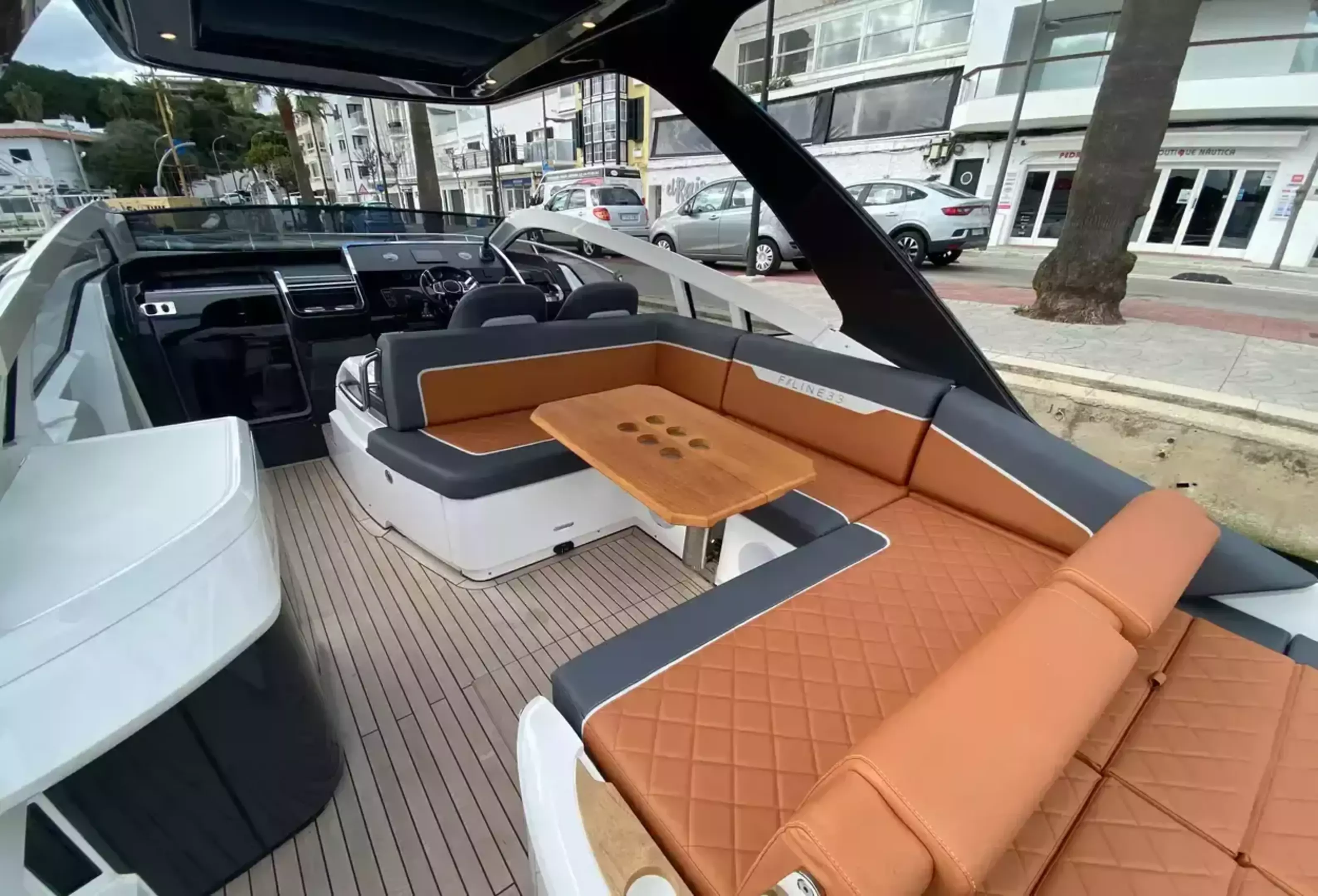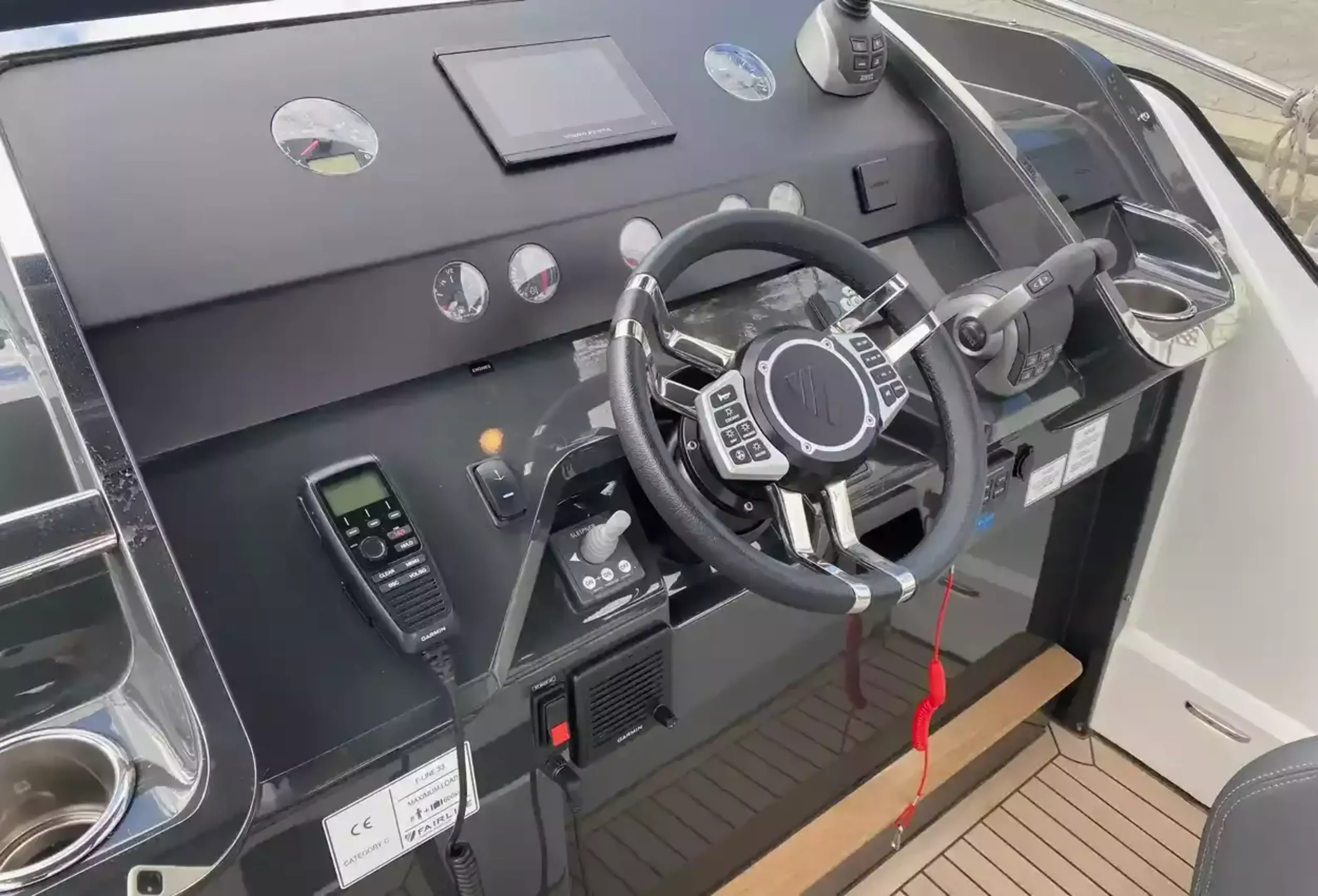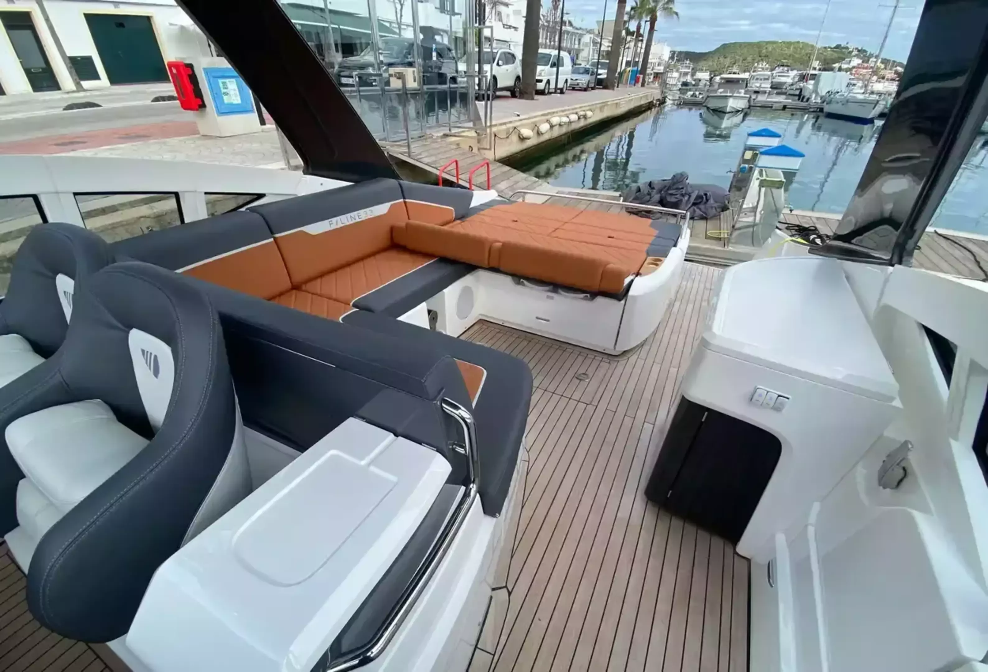 Boat Overview F//Line 33 with under 50 hours is now available, ex tax .With Manufactures warranty.Specifications & FeaturesFairline factory specification & fitted extras: Version 2 layout Hardtop to cockpit White exterior gel coat colour Black antifoul Bow thruster Joystick control Autopilot Wireless phone charger to helm