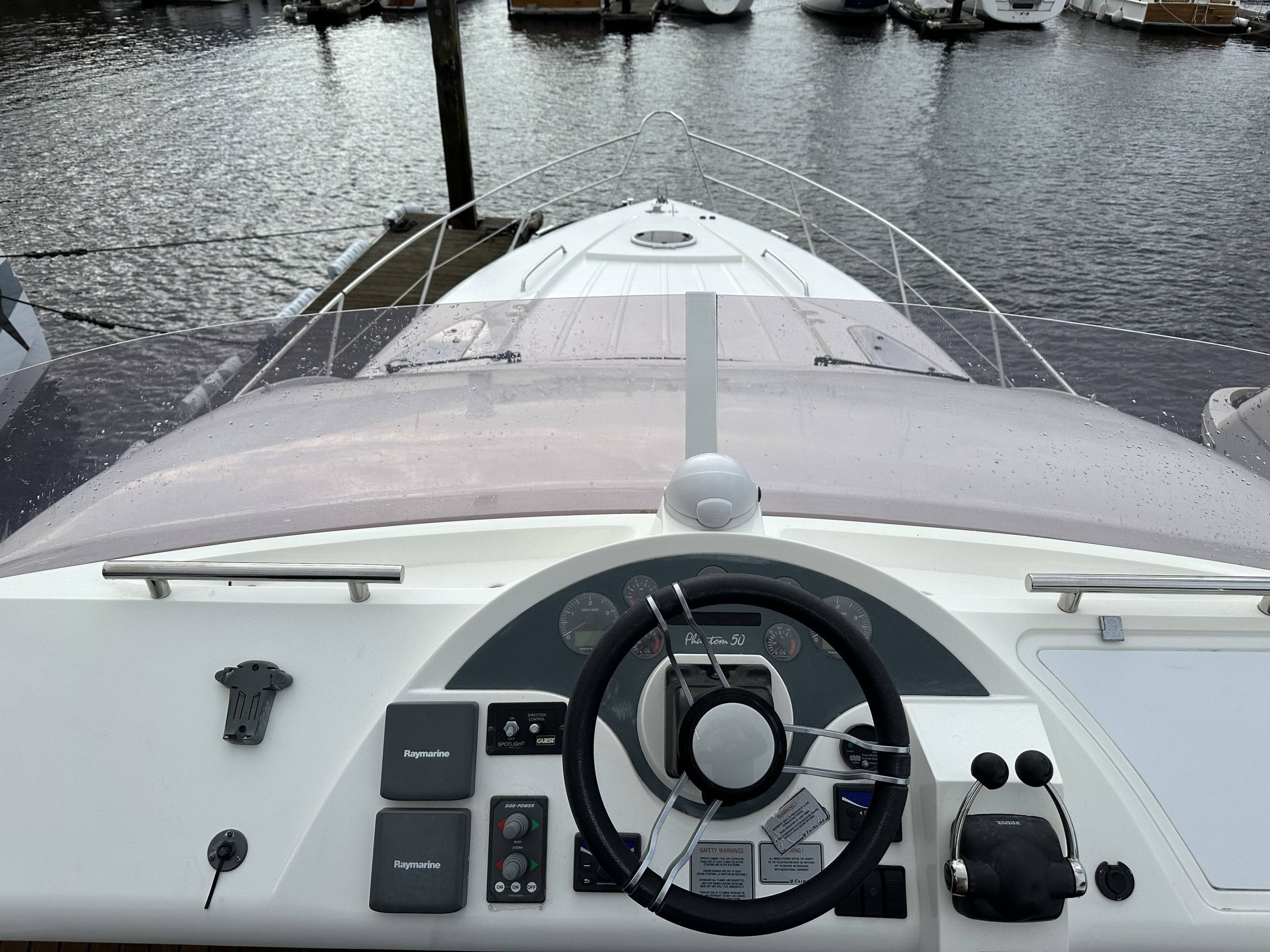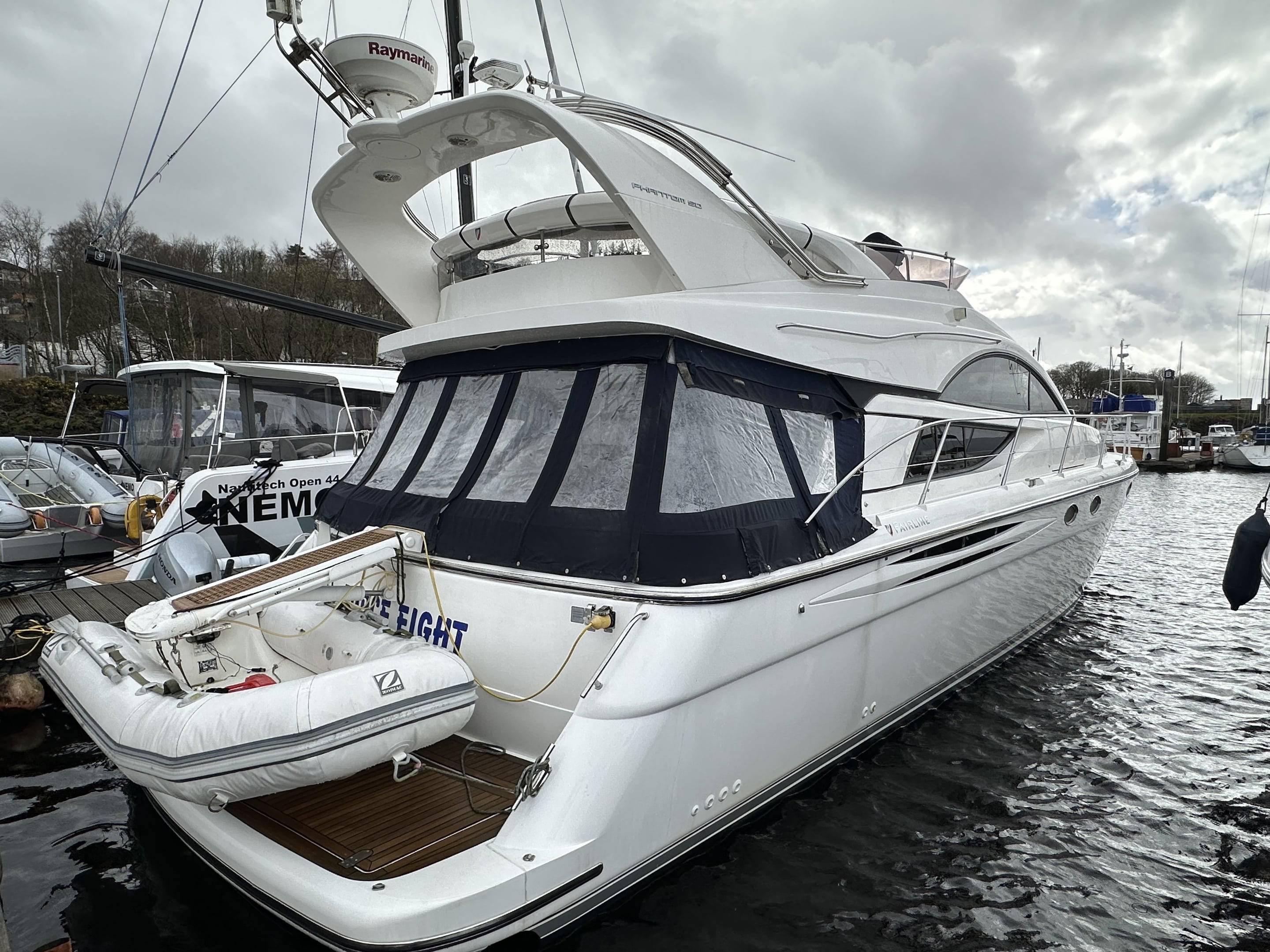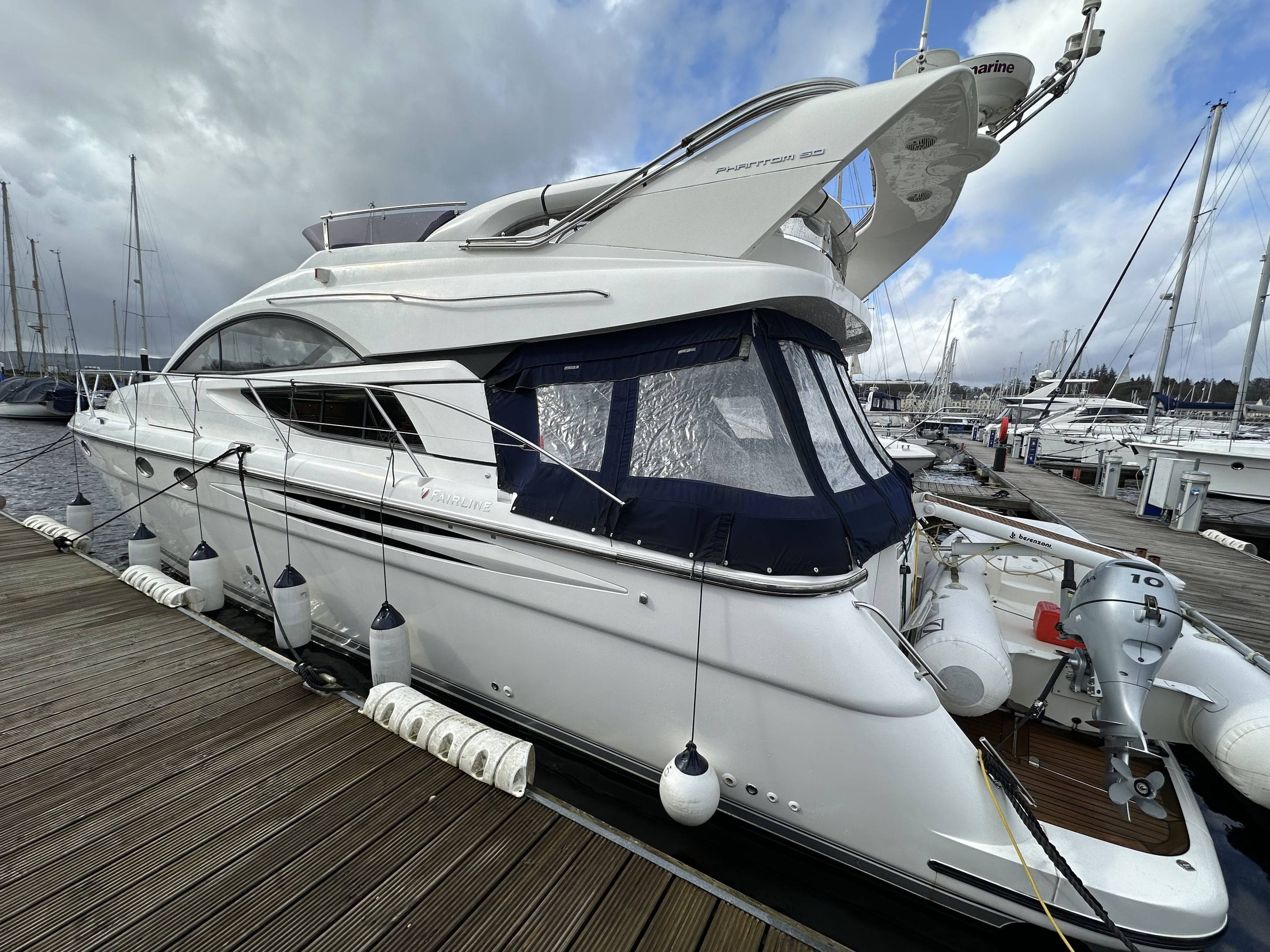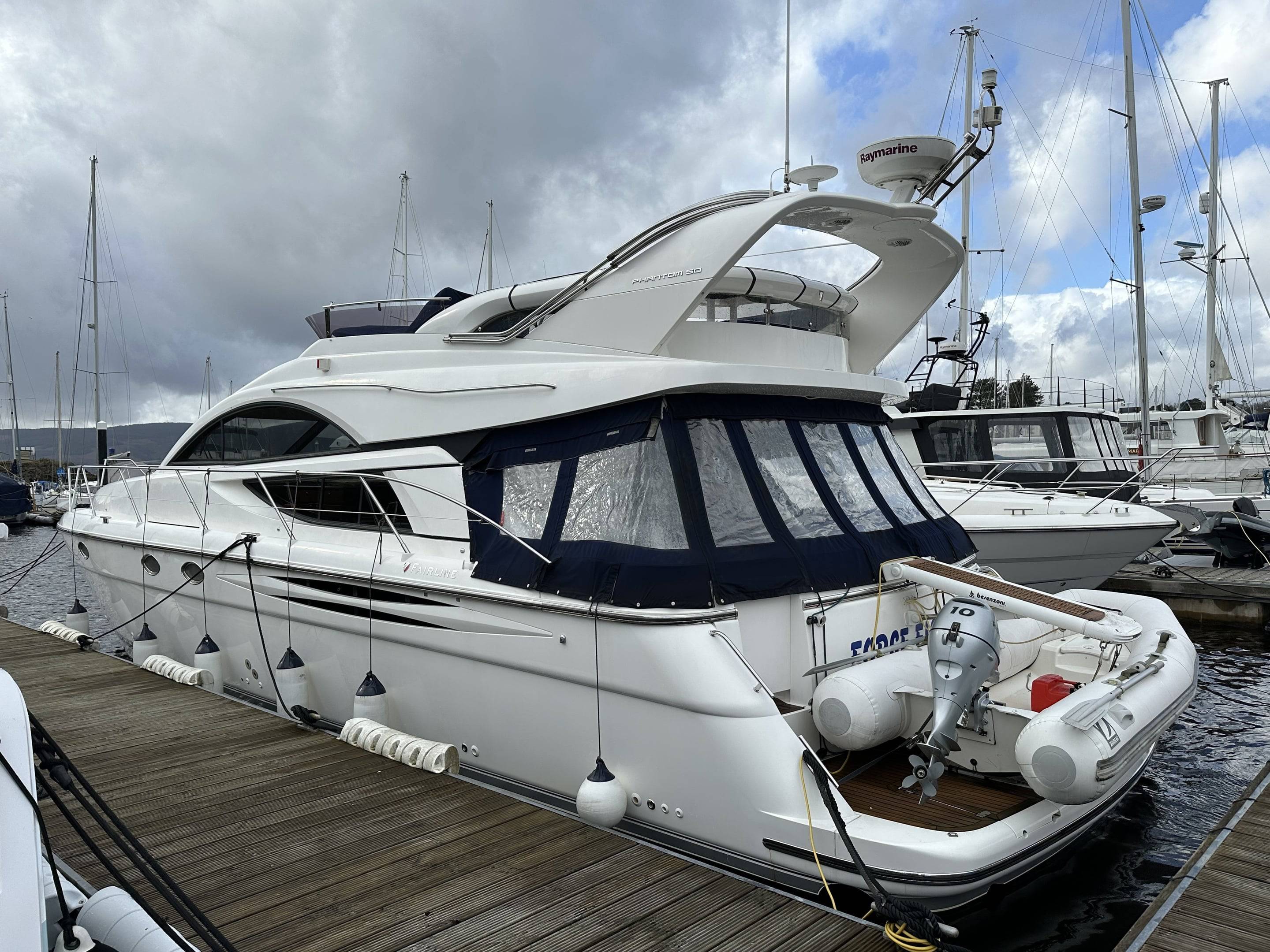2008 Fairline Phantom 50 fitted with twin Volvo D12 715 EVC Engines - 540 hours use, just one owner from new and supplied by us. Used for day sailing only & Never slept on". Force Eight has been exceptionally maintained by the current owner, from the moment you step onboard the spacious and superbly equipped yacht it is obvious no expense has been spared keeping her in great condition. Specification includes: Bow & stern thrusters // Eberspacher diesel heating // Air Conditioning Reverse Cycle // Generator Upgrade to 17.5 KVA // Fitted Out Aft Cabin // Griddle to Flybridge, Holding Tank with Discharge to Sea & Deck // Additional fridge to galley // Refrigerator to Flybridge // Audio Upgrade BOSE 321 // Bimini Top // Mood Lights // Passerelle // Freezer to service room // Audio upgrade to all cabins // Teak to Flybridge // Under water lights // Fridge/Freezer to upstairs cupboard // Raymarine E120 // Raymarine Radar // Raymarine Autopilot // Dingy with 10hp Honda outboard // Washing machine - For more information please contact Boats.co.uk on 01702 258885 or email sales@boats.co.uk