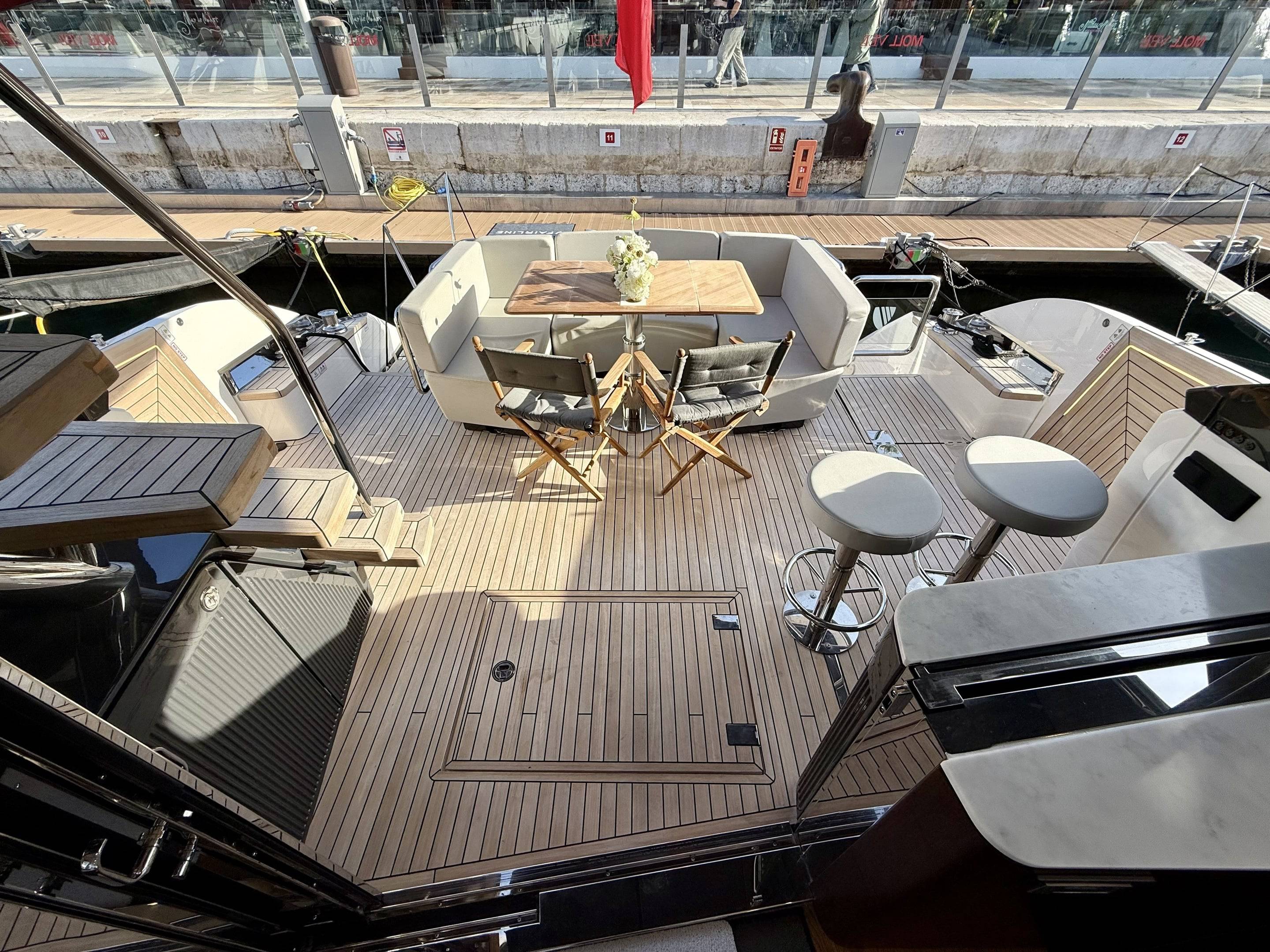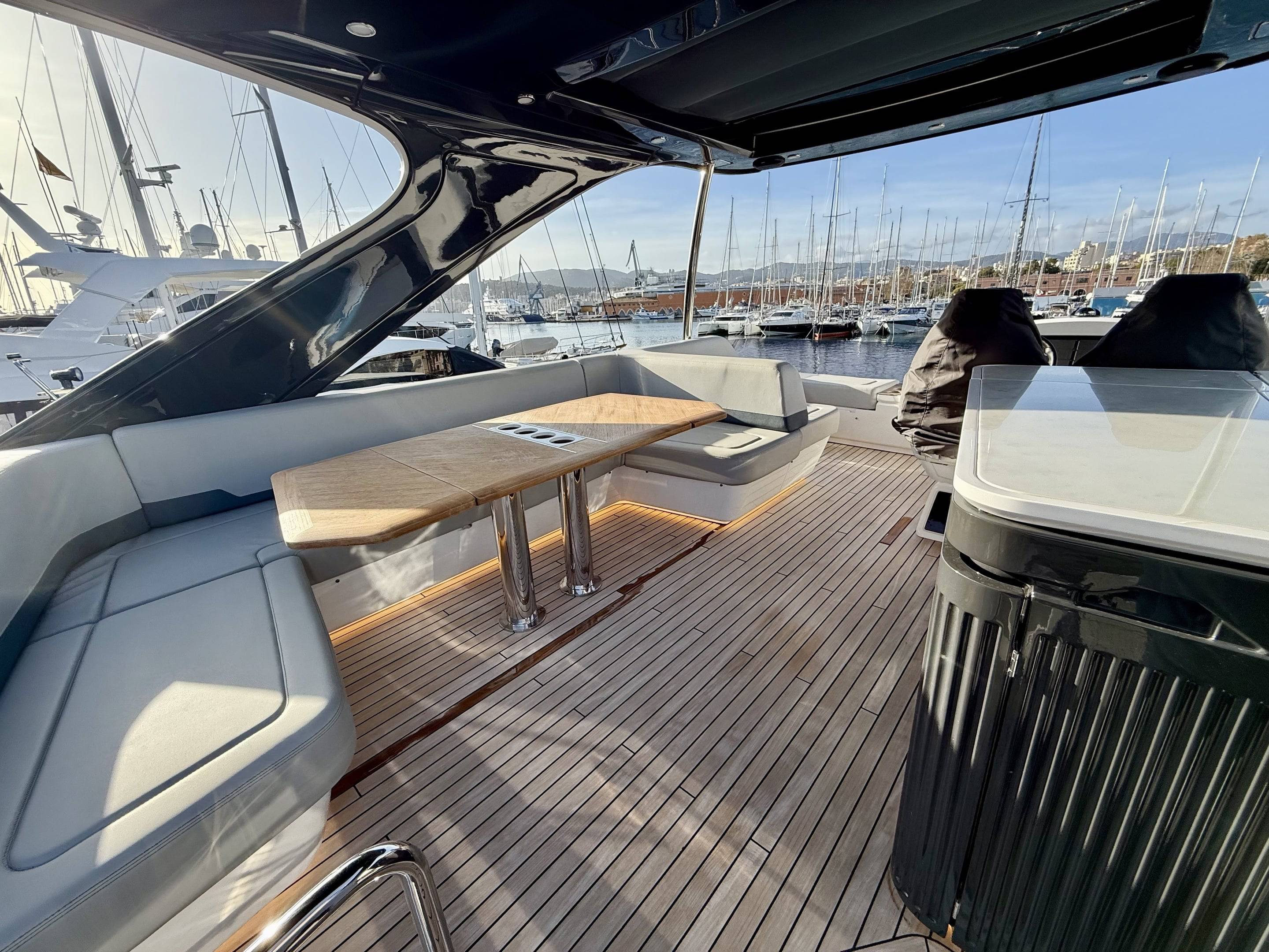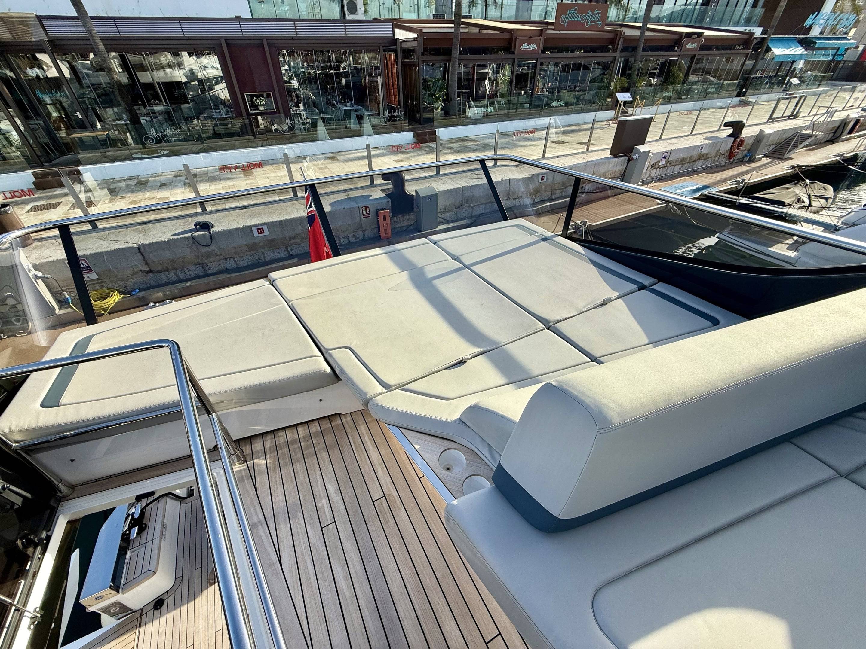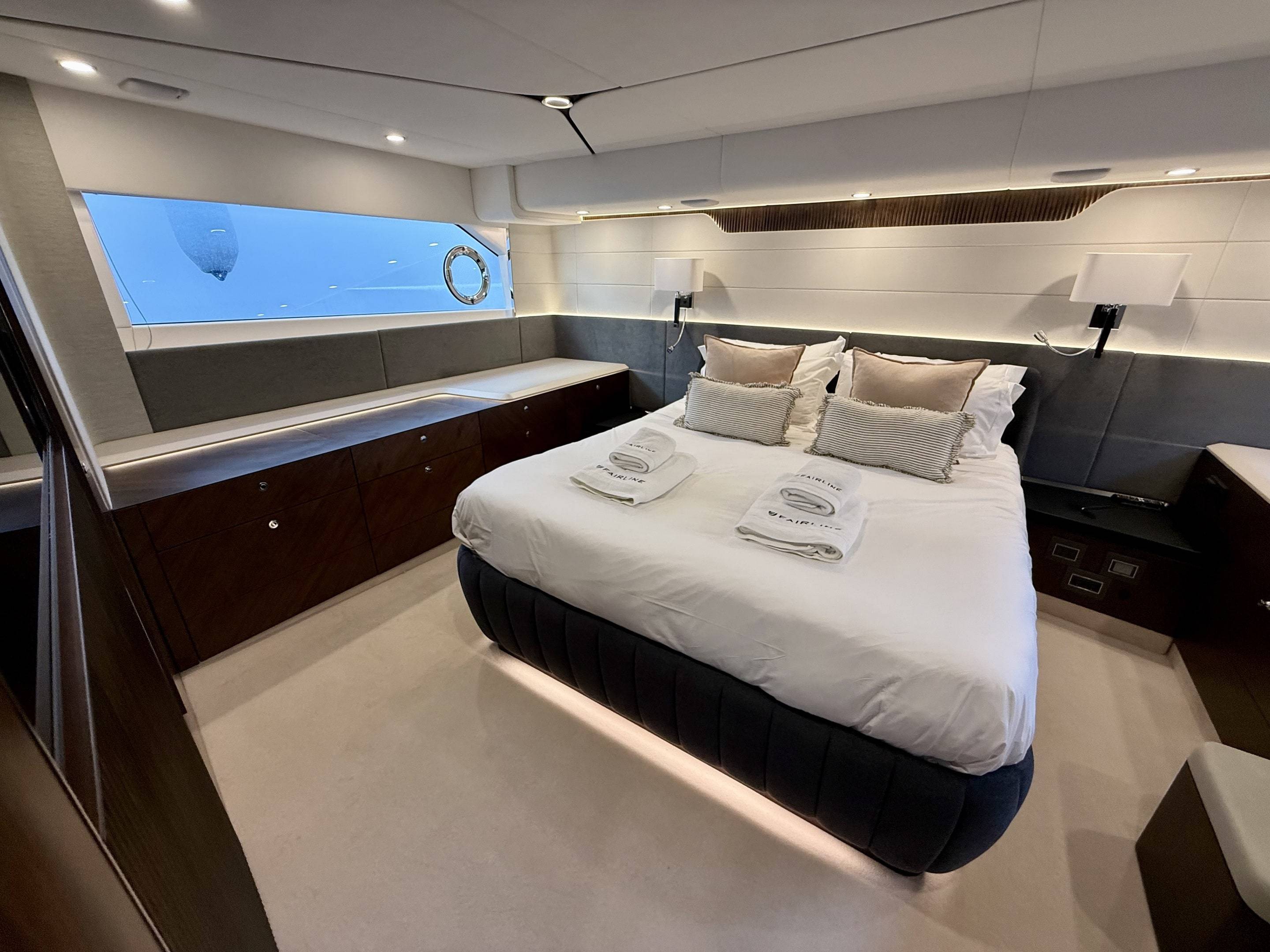 Welcoming a new to market LIKE NEW CONDITION 2025 Fairline Squadron 58: Fitted with twin Volvo Penta D13-100hp engines, currently running with just 240 hours. This is an extremely high specification including the top end interior finishes and all the technology too. The long list of additional options include: Gyroscopic Stabiliser / Hide and slide platform / Hydraulic passerelle / Beach club balconies, Modula furniture, glass transom and electric BBQ/Sink to aft / Flybridge hard top with integrated sliding roof / White LED mood lighting throughout / Underwater lights / Electric adjusting cockpit table / Crew cabin / Third control station / Fusion audio surround sound system / Stainless steel ultra anchor upgrade / Twin Garmin plotters to both helms / Joystick control / Humphries automatic trim tabs / Saloon drop down windows to galley area and forward saloon / Satin walnut interior wood / Deep pile cream carpets / Additional sideboard to saloon in lieu of sofa / Smart TVs to saloon and all guests cabins and the list is endless. This is one of the nicest colour pallet specifications chosen to the market and a full specification with all the technical upgrades included. A fantastic opportunity to own one of the first second hand 58's still with warranty on the market and in Like new condition! Contact BoatsCo today for all the details and to arrange a viewing.